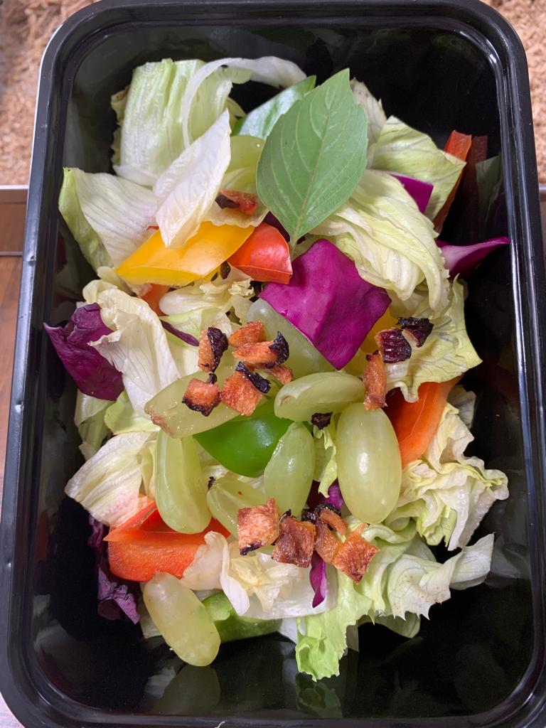Contrains ICEBERG, LETUCE, BELL PEPPERS, BASIL, GRAPES & DRIED PLUM CHOPPED WITH OLIVE OIL VINAIGRETTE
