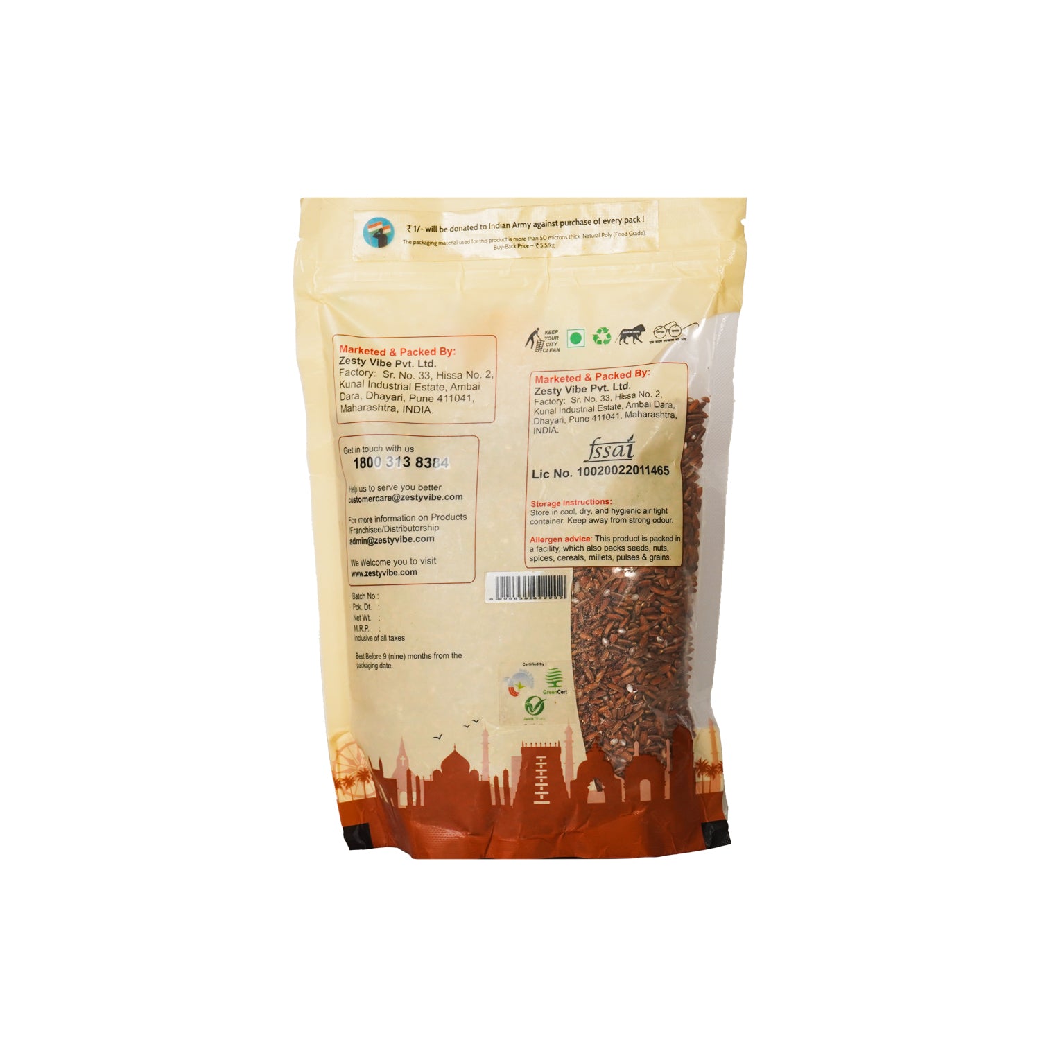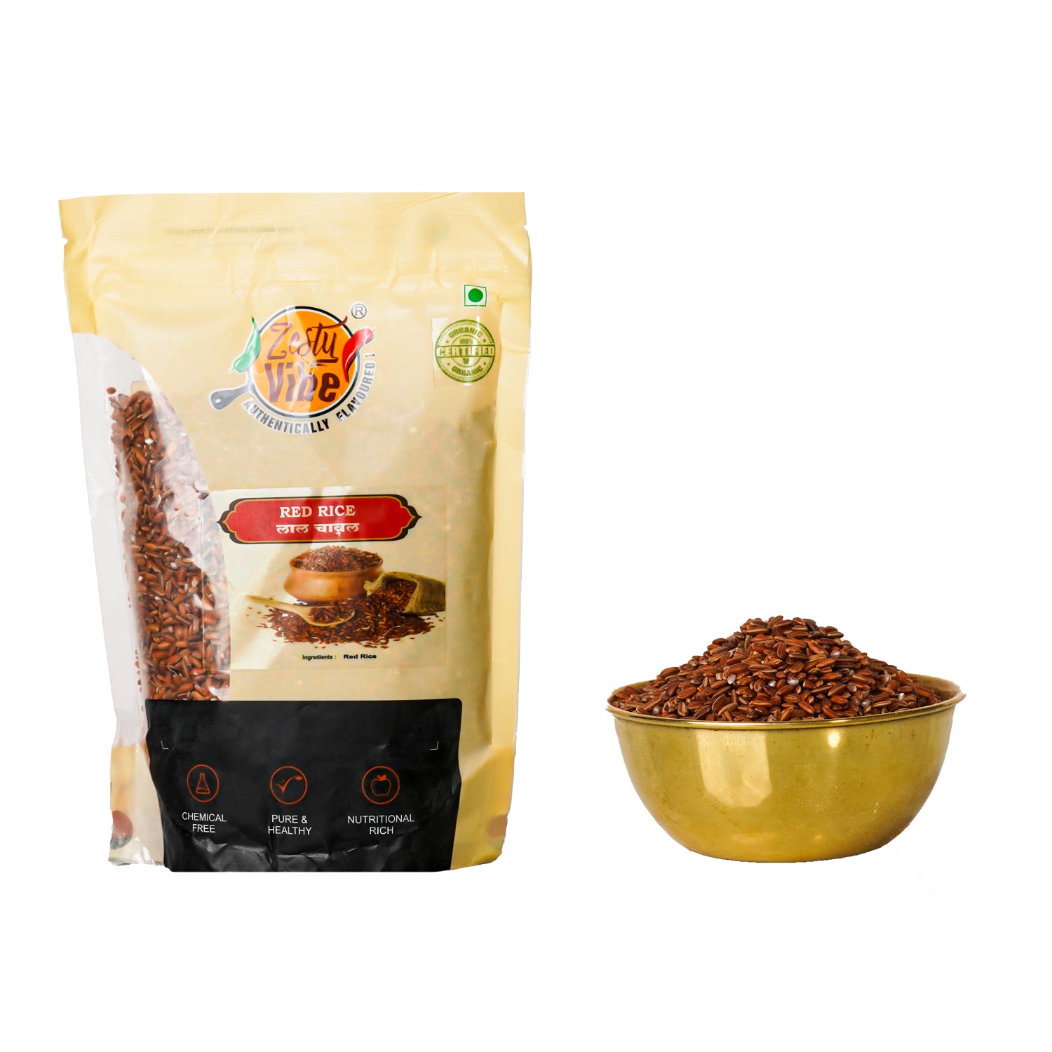 - ज़ेस्टी वाइब्स लाल चावल शाकाहारी, एनपीओपी प्रमाणित, जैविक और रसायन मुक्त है, यह अनपॉलिश्ड है और इसमें कोई मिलावट नहीं है।