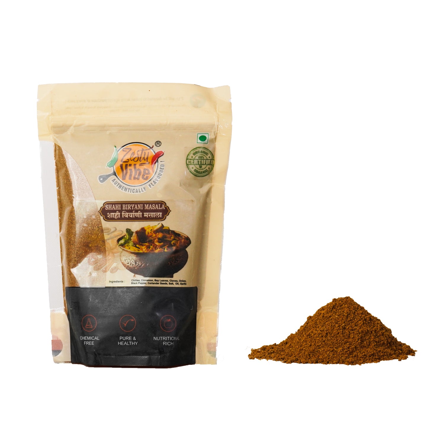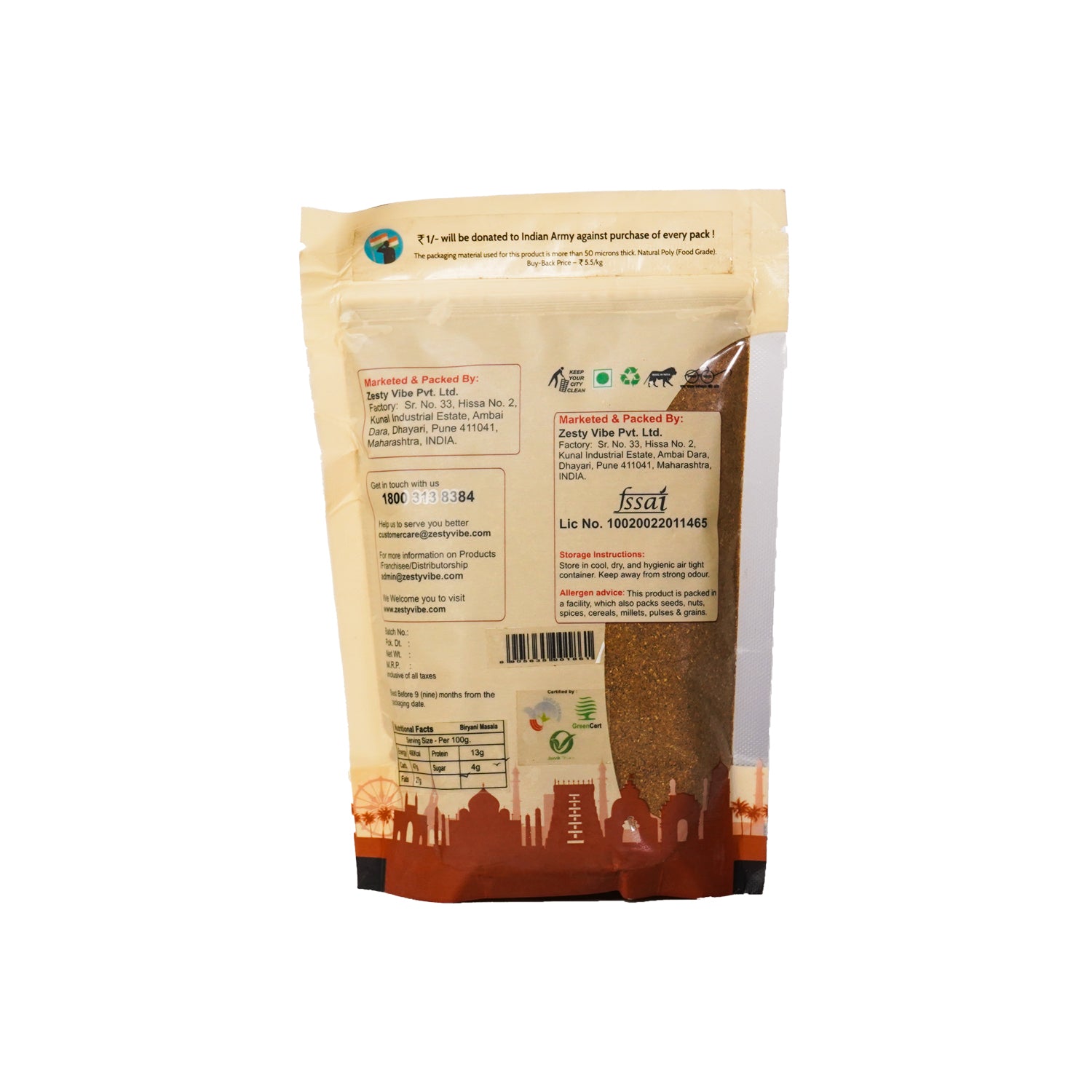 साहित्य धणे, तमालपत्र, काळी मिरची, अजवाइन, काळी मलई, गदा, स्टार अँनी, जायफळ, लवंग, दालचिनी, सायट्रिक आम्ल, मीठ सुगंधी आणि तिखट, राजेशाही शैलीचे भासवणारे - मुघल प्रेरित असल्यामुळे, हळूहळू शिजवलेल्या दम बिर्याणीला आमच्या दम बिर्याणी मसाल्यामध्ये...