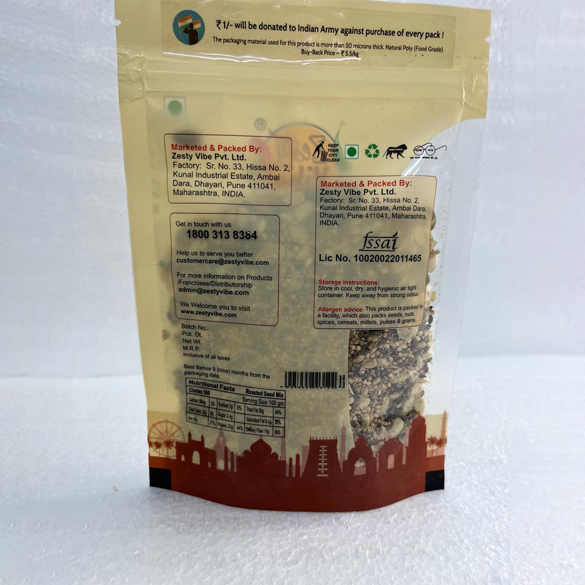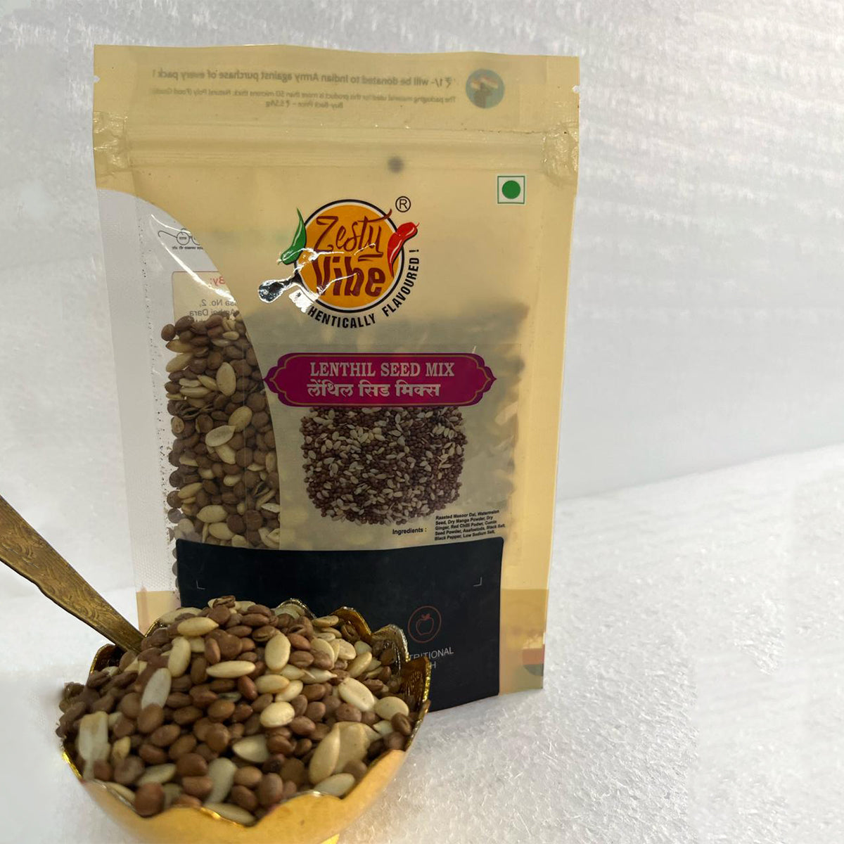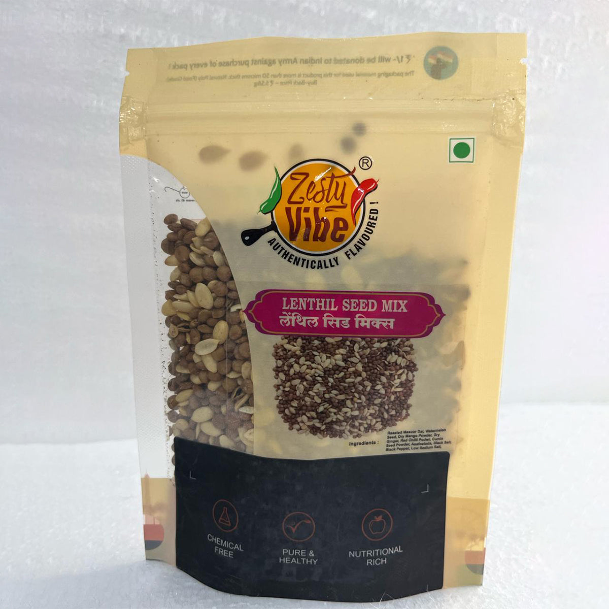 झेस्टी व्हिब लेंटिल सीड मिक्समध्ये भाजलेल्या डाळींसह सुपर-बियाण्यांचा समावेश असतो, या सर्वांमध्ये वनस्पती-आधारित प्रथिने भरपूर प्रमाणात असतात ज्यामध्ये प्रति १०० ग्रॅम सुमारे २० ग्रॅम प्रथिने असतात.
